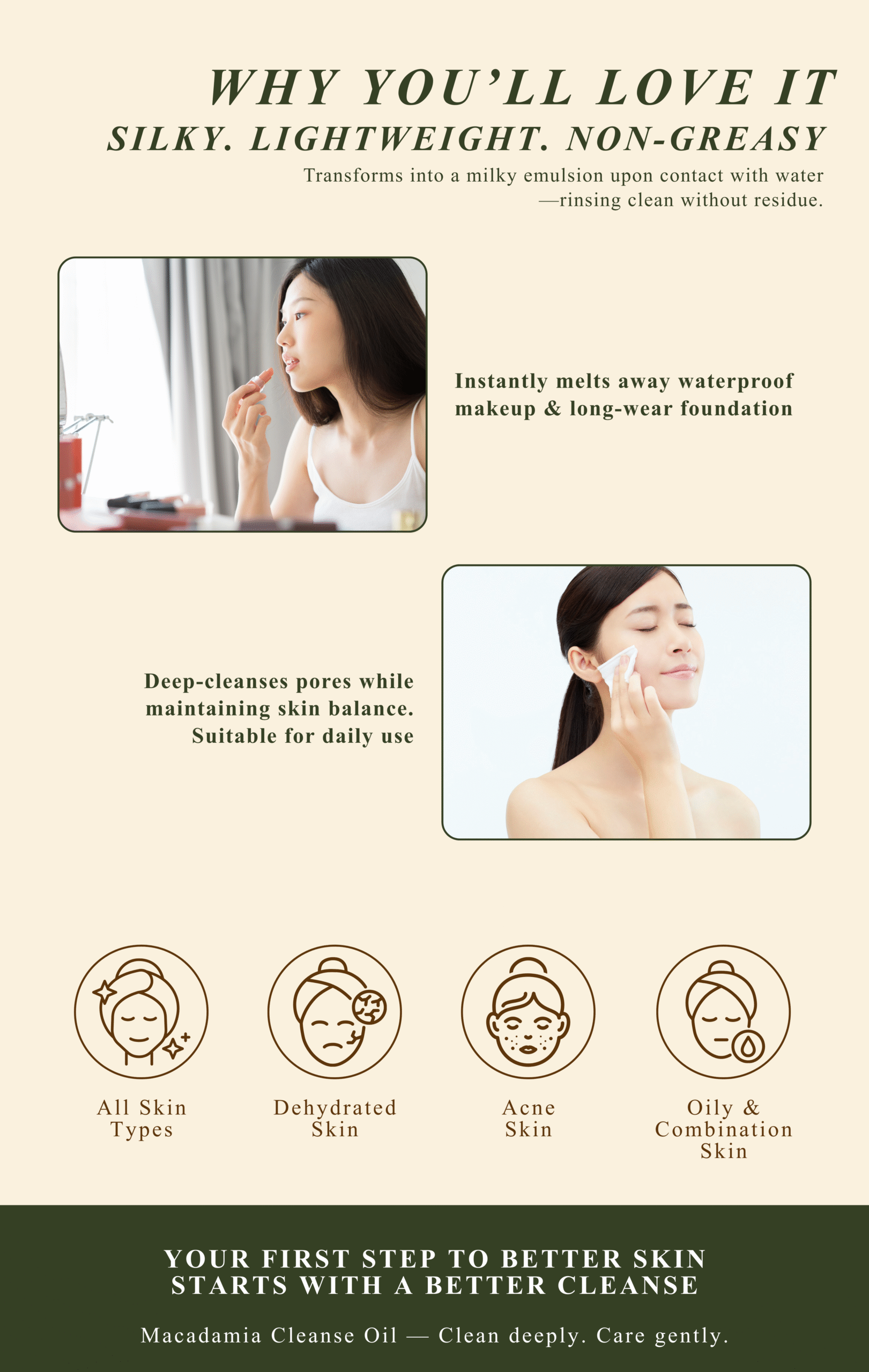 Discover a cleansing oil that delivers both comfort and performance. This lightweight yet effective formula is infused with Macadamia Seed Oil to gently remove waterproof makeup, sunscreen, and deep-seated impurities. It glides smoothly across the skin, cleansing thoroughly without disrupting the skin’s natural moisture balance.